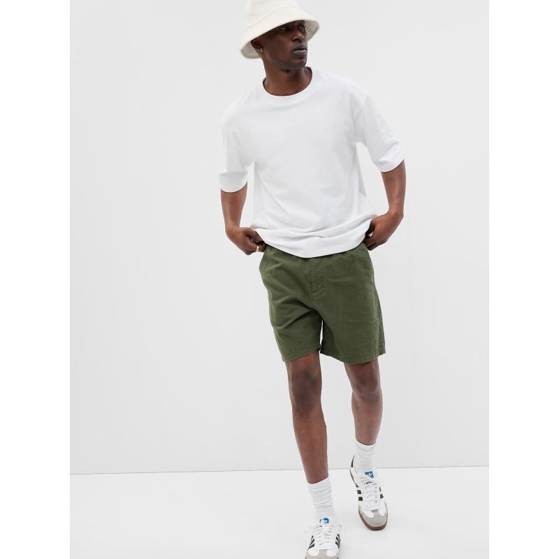 Pánské kraťasy.Materiál len a bavlna.Pružný pas se zapínáním na zip a knoflík.Přední šikmé kapsy.Jednobarevné.Délka vnitřního švu 18 cm. 55 % len, 45 % bavlna