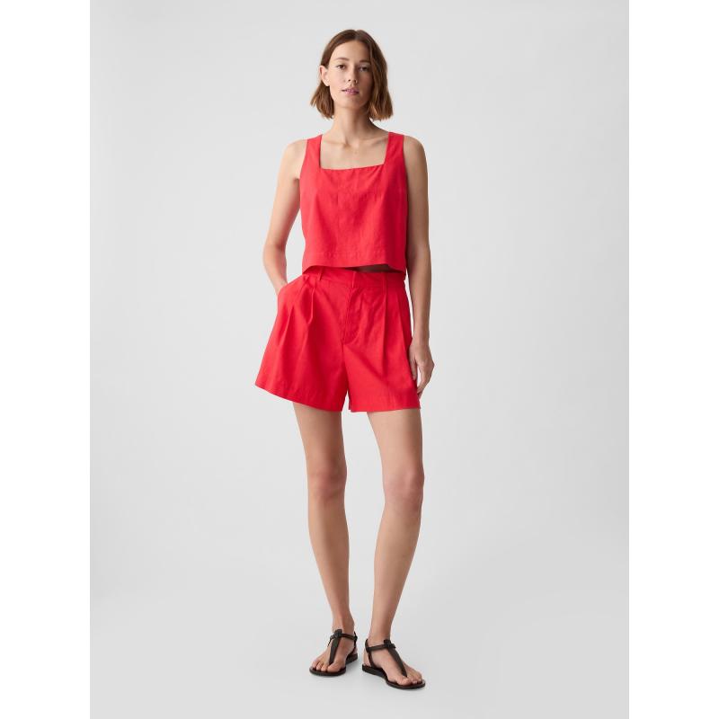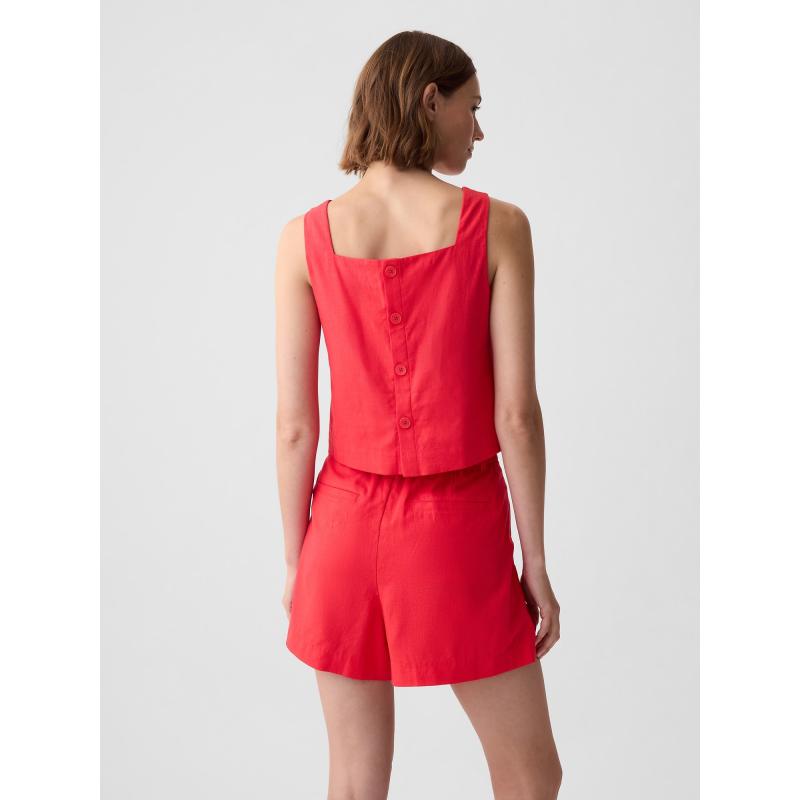 Dámský lněný crop top.Materiál len a viskóza.Hranatý výstřih a široká ramínka.Na zádech zapínání na knoflíky.Rovný střih a kratší délka. 55 % len, 45 % viskóza