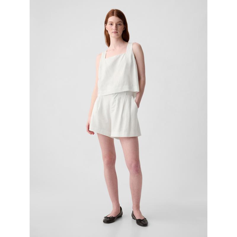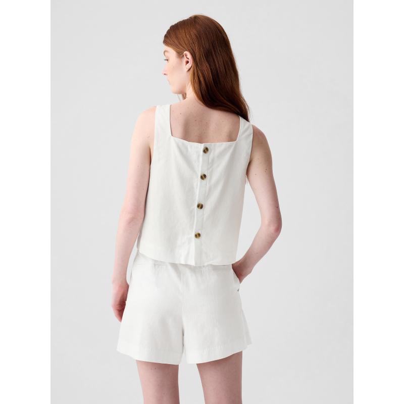 Dámský lněný crop top.Materiál len a viskóza.Hranatý výstřih a široká ramínka.Na zádech zapínání na knoflíky.Rovný střih a kratší délka. 55 % len, 45 % viskóza