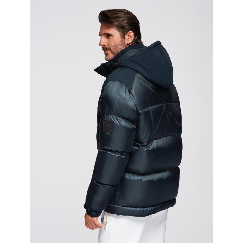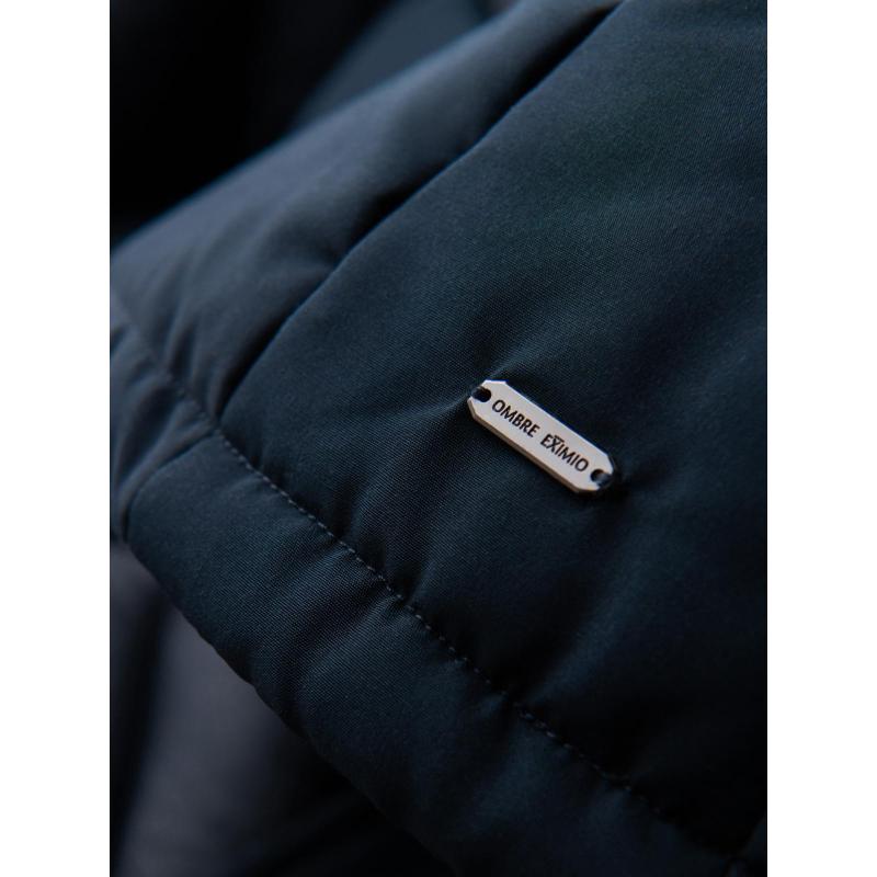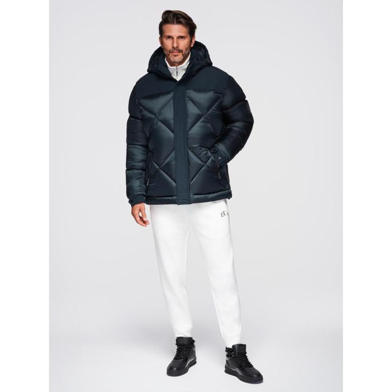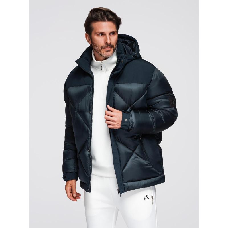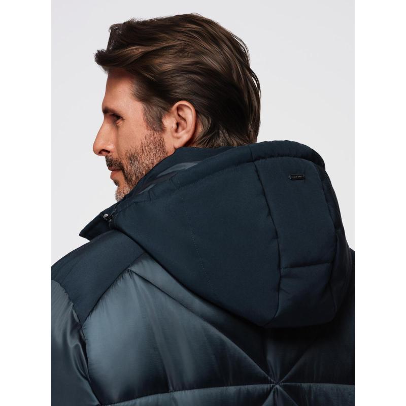 Pánská bunda s kapucí a geometrickým prošíváním ve tvaru diamantů – tmavě modrá V2 OM-JAHP-0237