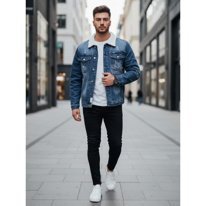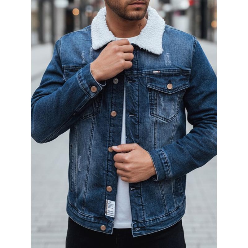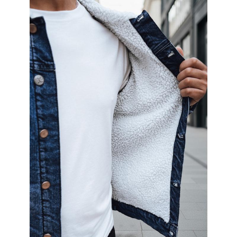Pánská džínová bunda s podšívkou z kožešiny tmavě modrá