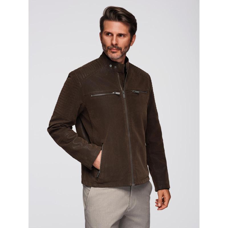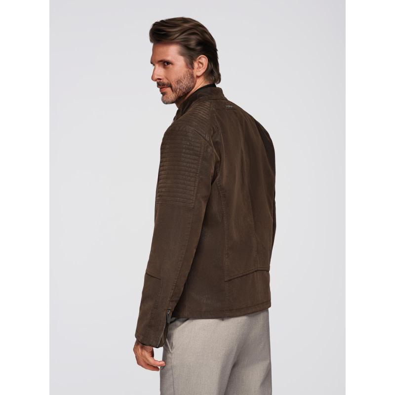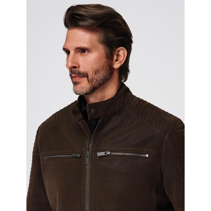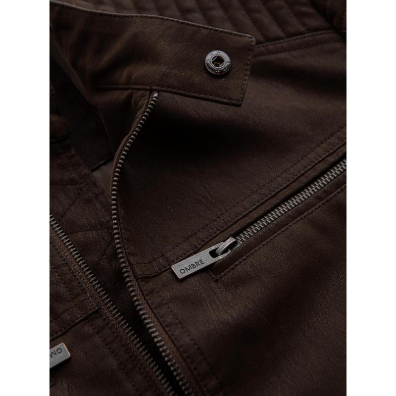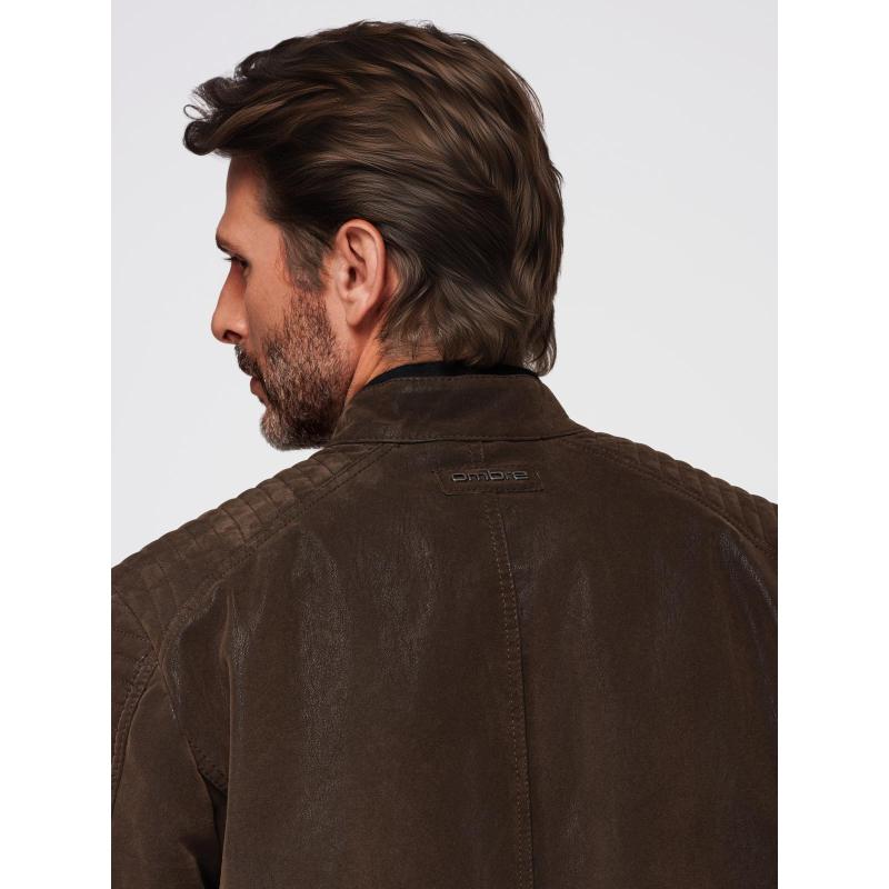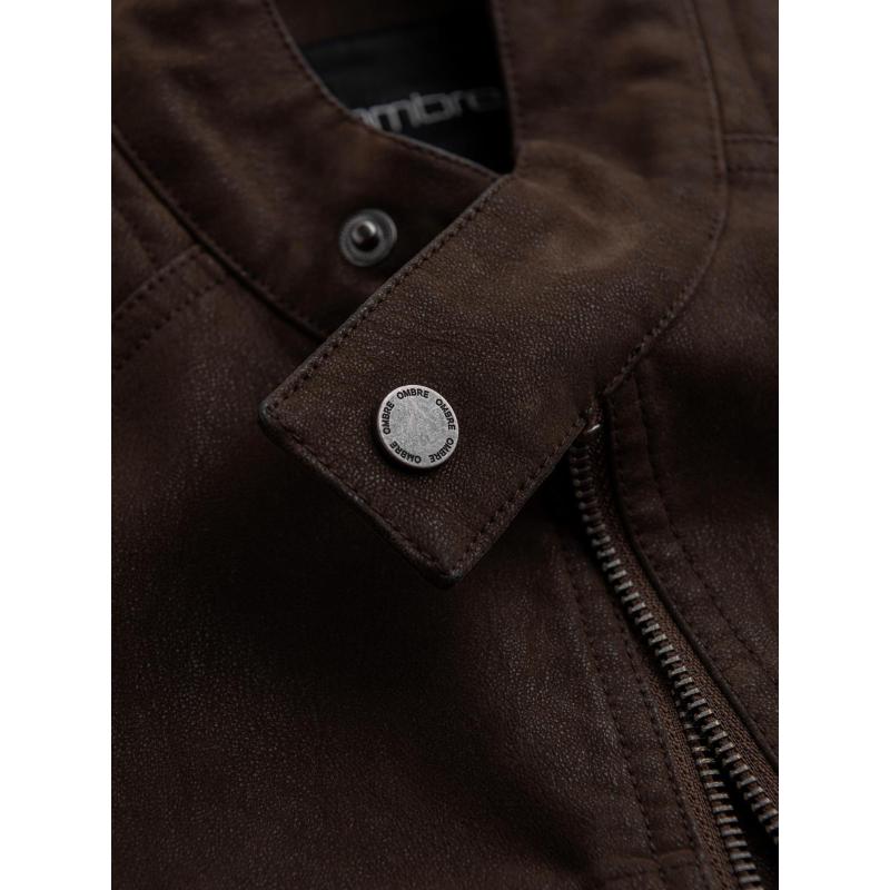 Pánská stylová bunda z ekologické kůže s límcem – tmavě hnědá V1 C637