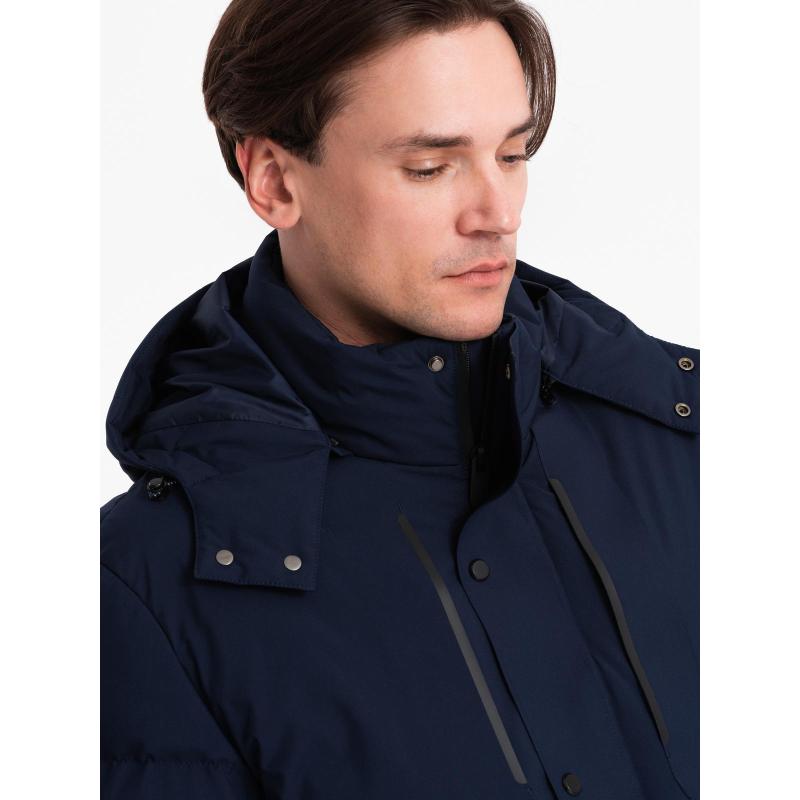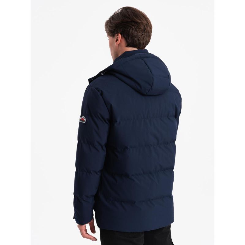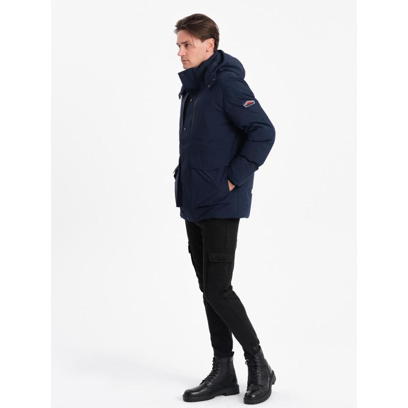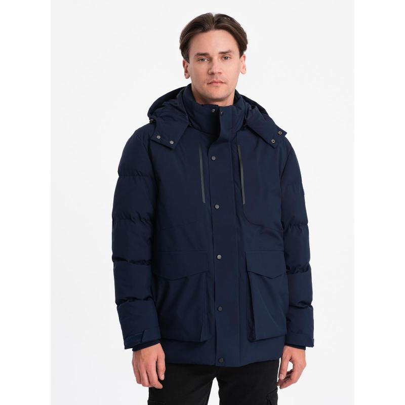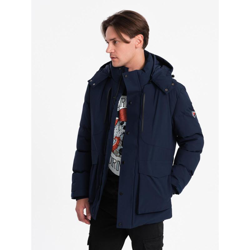 Pánská zimní bunda s odnímatelnou kapucí z nepromokavého materiálu – tmavě modrá V1 OM-JAHP-0306