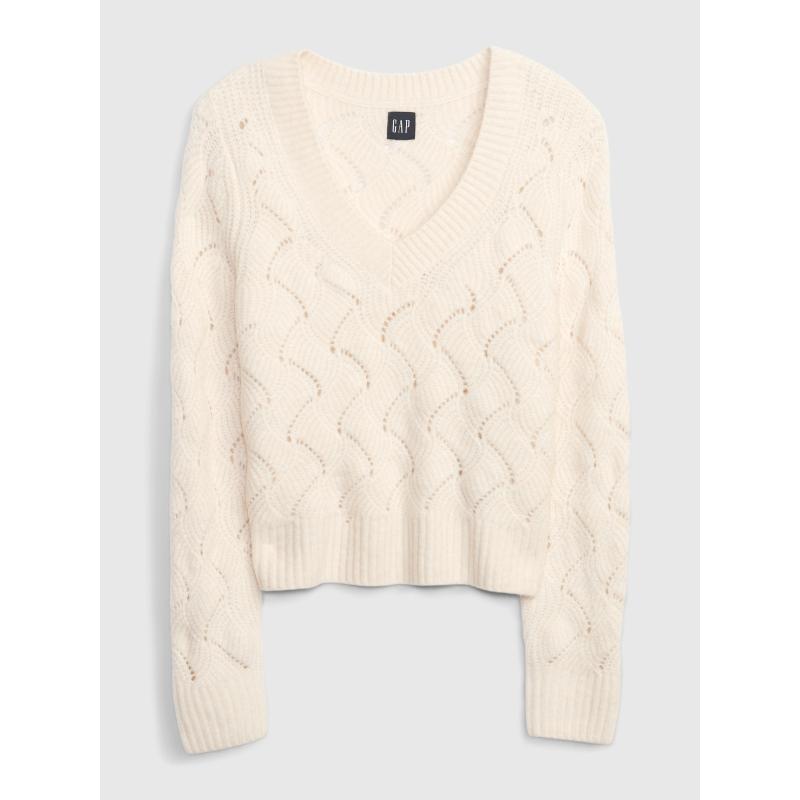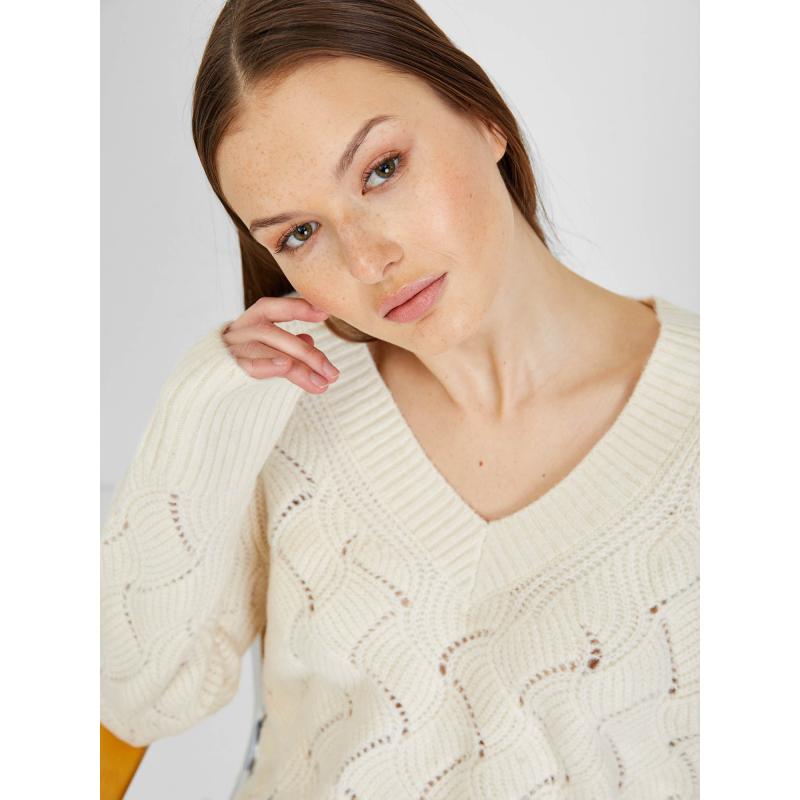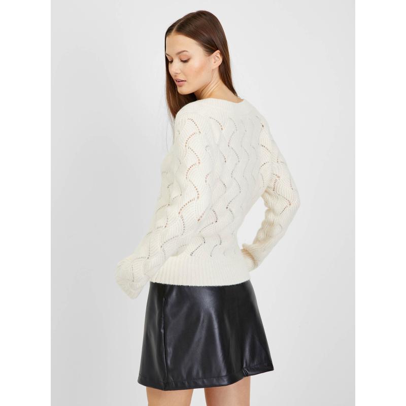 Dámský pletený svetr.Zajímavý vlnkovaný vzor.Jemná měkká pletenina.Výstřih do V s žebrovaným lemem.Dlouhé rukávy s náplety.Kratší délka.S příměsí vlny. 61 % akryl, 30 % Nylon, 6 % elastan, 3 % vlna