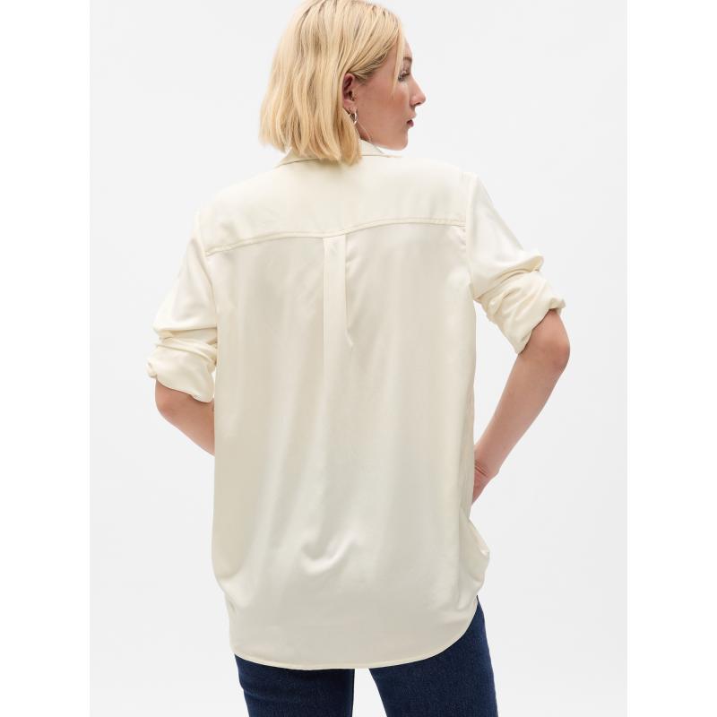 Dámská saténová košile.Košilový límec a zapínání na knoflíčky.Na hrudi našitá malá kapsička.Dlouhé rukávy s manžetou.Rovný střih.Zaoblený spodní lem. 100 % polyester