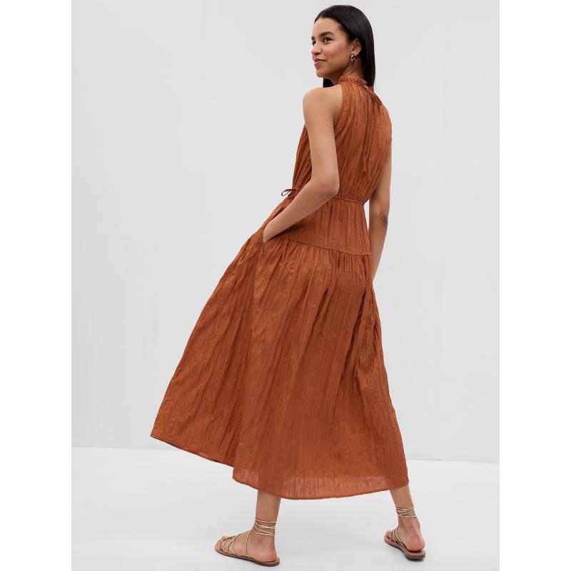 Dámské jednobarevné midi šaty.Záměrně mačkané se saténovým leskem.Výstřih ke krku s ozdobným kanýrem.Zavazování za krkem.Zvýrazněný pas na zavazování.Střih do A a boční kapsy. 100 % polyester