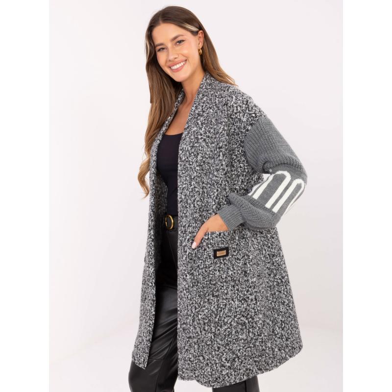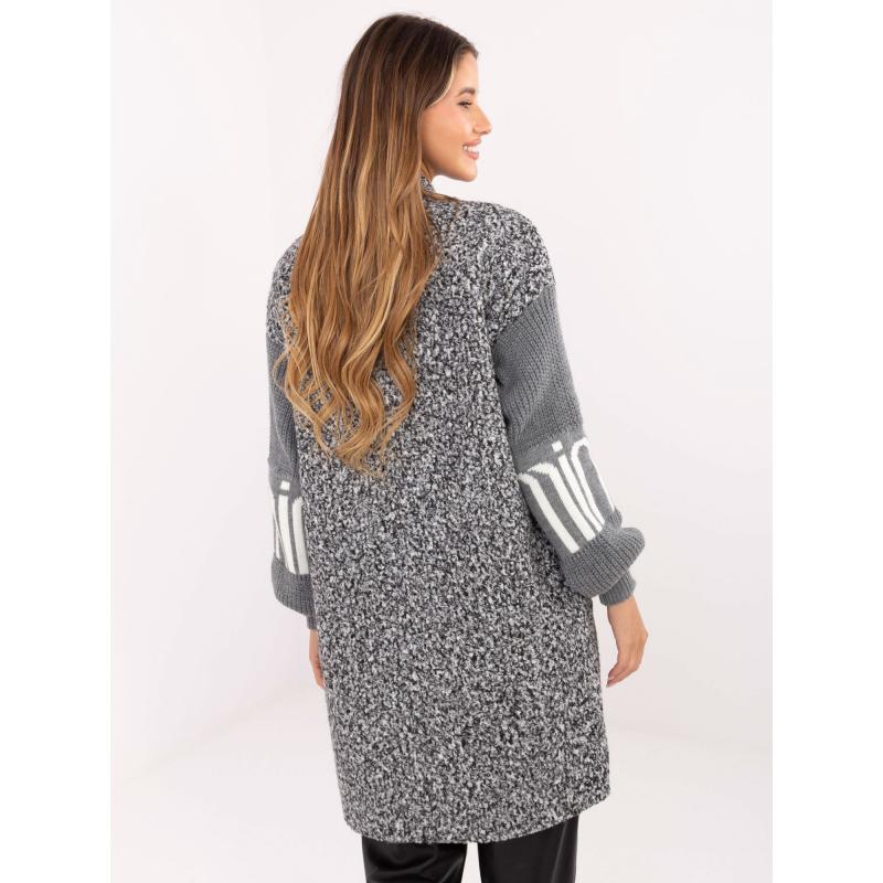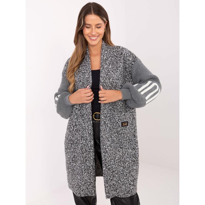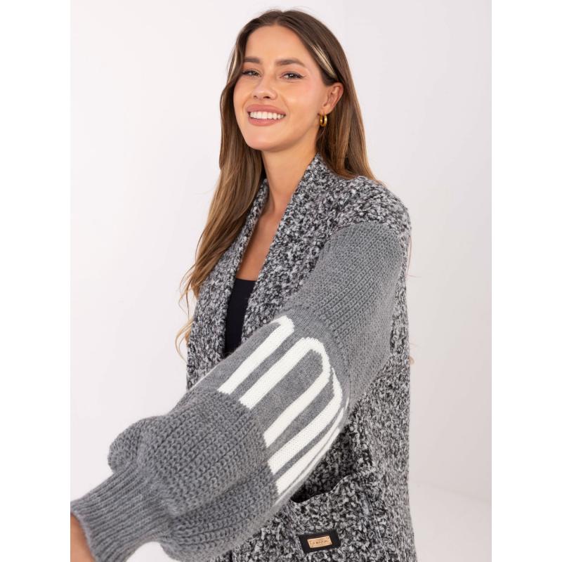Šedý dámský kardigan s pletenými rukávy.