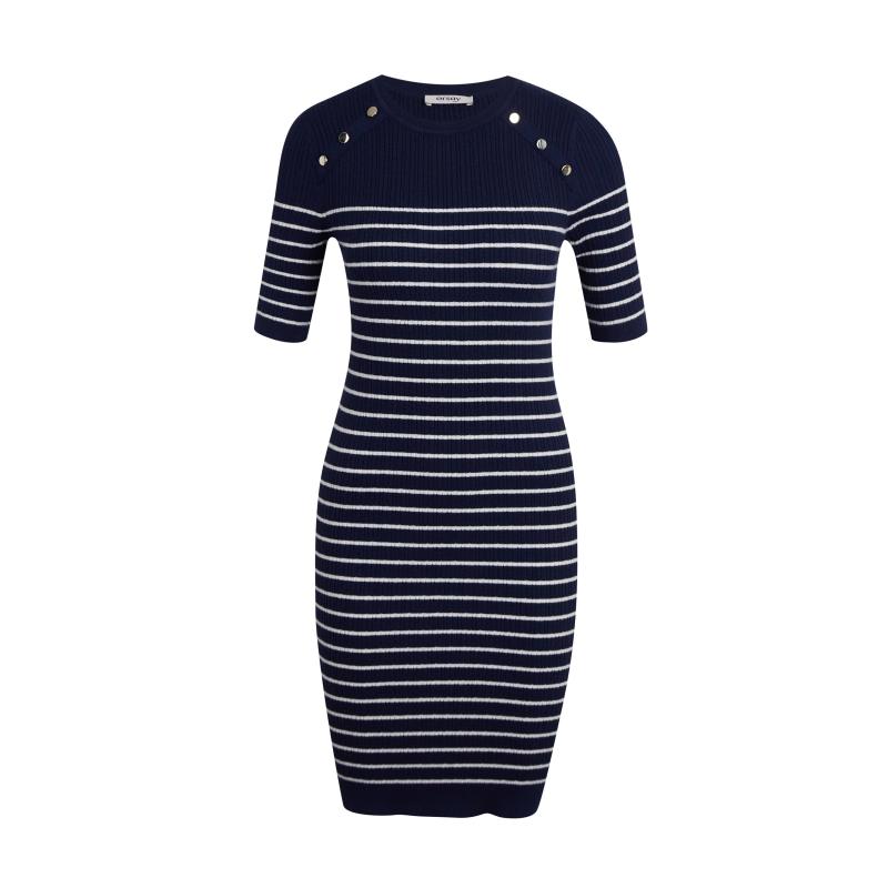 Barva: tmavě modráStřih: pouzdrovýDélka: ke kolenůmDélka rukávu: krátkýVýstřih: kulatýVzor: pruhovanýMateriál: 51 % polyester, 49 % bavlnaKód produktu: 530398575000
