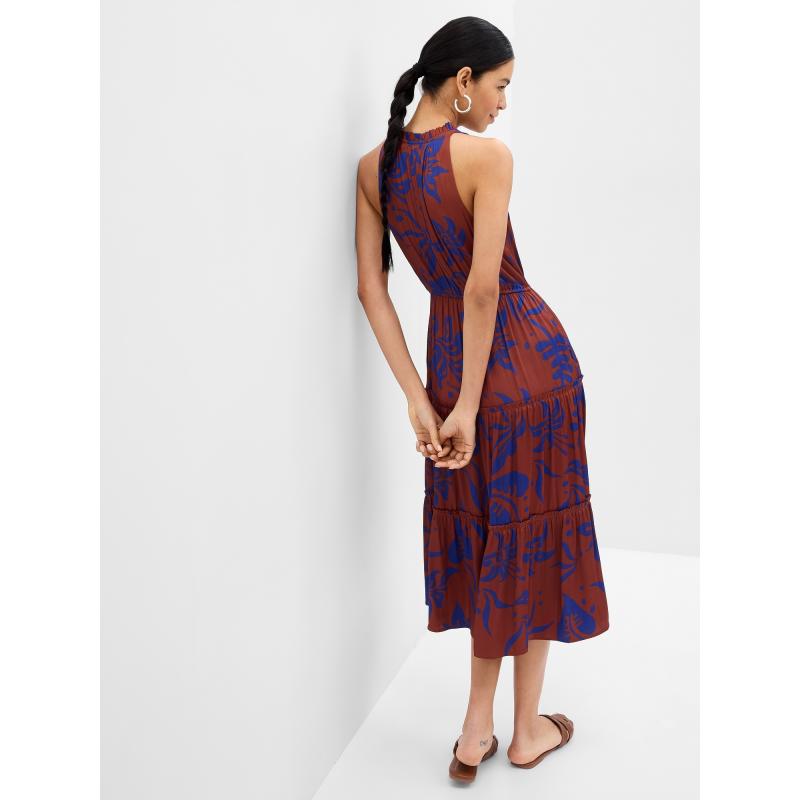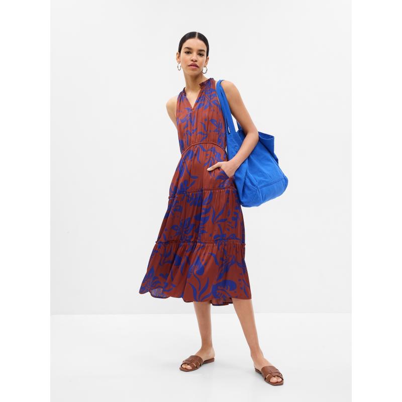 Dámské vzorované šaty.Midi délka.Bez rukávů.Výstřih do V.Zvýrazněný pružný pas.Vrstvené volány.Střih do A.Přední šikmé kapsy. 100 % polyester