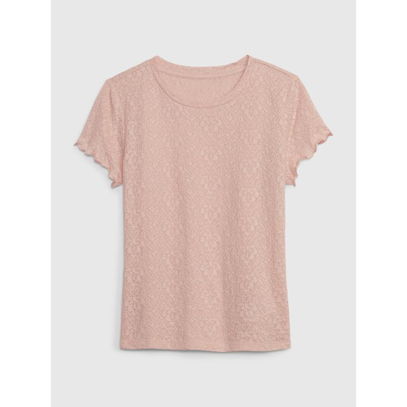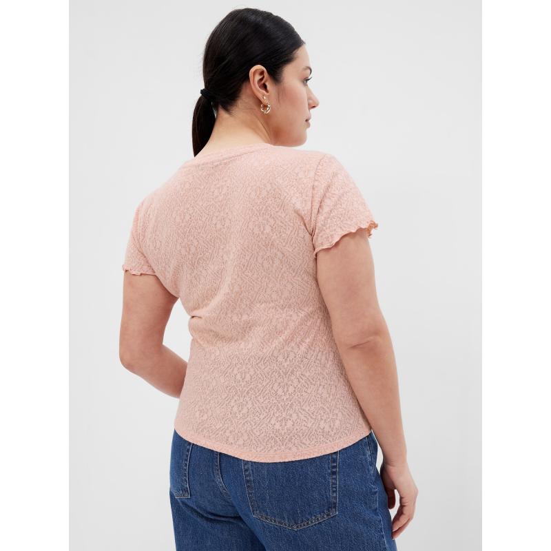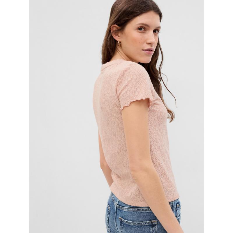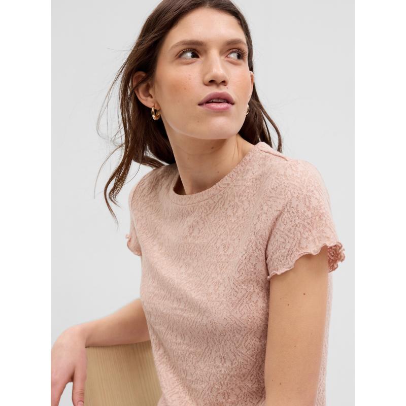 Dámské tričko s krátkým rukávem.Kulatý výstřih ke krku.Plošný krajkový vzor.Rukáv s ozdobnou vlnkou.Rovný střih. 85 % bavlna, 15 % polyester